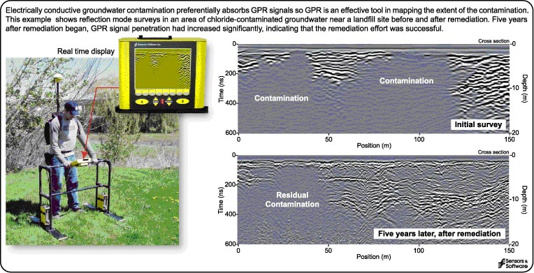 應(yīng)用二:用地質(zhì)雷達(GPR)實時間隔性測量,環(huán)保部門并同時有效的開展應(yīng)急補救措施。 |