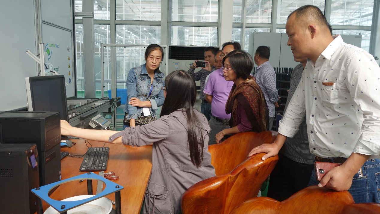 不結(jié)球白菜生長(zhǎng)發(fā)育過程中表型變化2015年10月19日下午,杭州桐廬縣科學(xué)技術(shù)協(xié)會(huì)成員在我們公司栽培主管何紅梅的陪同下對(duì)AgriPheno?平臺(tái)進(jìn)行參觀考察。平臺(tái)技術(shù)工程師周曉雙向各位來訪領(lǐng)導(dǎo)詳細(xì)介紹了德國(guó)Lemnatec高通量Scanlyzer 3D植物表型系統(tǒng)。