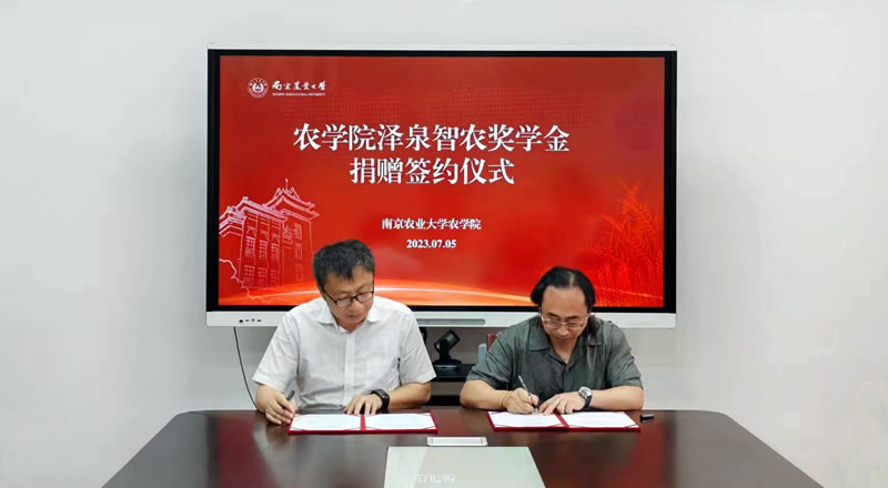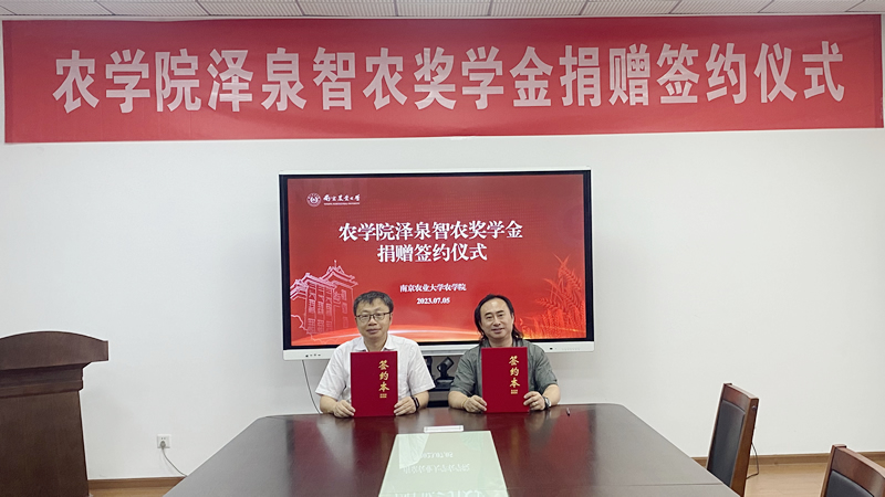 2023年7月5日上午, “澤泉智農(nóng)”獎學金捐贈簽約儀式在南京農(nóng)業(yè)大學農(nóng)學院舉行。農(nóng)學院黨委書記莊森,農(nóng)學院教授姜東,上海澤泉科技股份有限公司總經(jīng)理顧群、銷售經(jīng)理劉琦出席捐贈儀式。簽約儀式由農(nóng)學院黨委書記莊森主持。