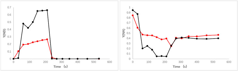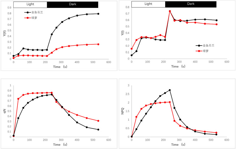 在非光化學(xué)淬滅方面,衰老綠蘿葉片表現(xiàn)出極高的NPQ和Y(NPQ)。弱光(60 μmol·m?2·s?1)照射便能誘導(dǎo)綠蘿葉片出現(xiàn)顯著NPQ峰值(約2.028),而金魚吊蘭葉片NPQ在強(qiáng)光750 μmol·m?2·s?1下才達(dá)到類似水平。這表明衰老葉片中的熱耗散機(jī)制極度活躍,弱光便可高度激活。綜合而言,衰老葉片吸收的光能主要通過NPQ強(qiáng)力耗散,而光化學(xué)轉(zhuǎn)化大幅削弱。