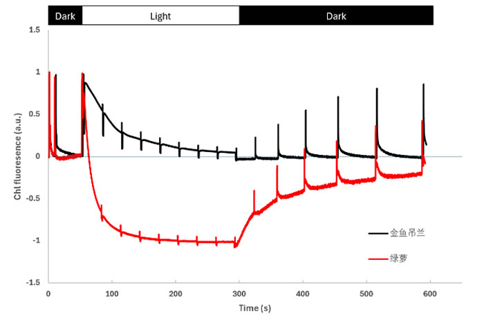 采用Dual-PAM/F光纖版雙通道葉綠素?zé)晒鈨x(Heinz WALZ, GmbH)同步測量葉綠素?zé)晒馀cP700?吸收信號。葉片暗適應(yīng)20分鐘后進(jìn)行光誘導(dǎo)與暗馳豫測量。綠蘿葉片采用60 μmol·m?2·s?1光化光照射,記錄熒光動(dòng)力學(xué)曲線并監(jiān)測暗馳豫;金魚吊蘭葉片采用750 μmol·m?2·s?1光化光照射,其余條件相同。通過Dual-PAM軟件計(jì)算Fo、Fs、Fm、Fv/Fm、Y(II)、qP、NPQ以及P700?吸收等參數(shù),并將所有熒光與P700曲線分別以Fo、Fm和Po、Pm歸一化處理。