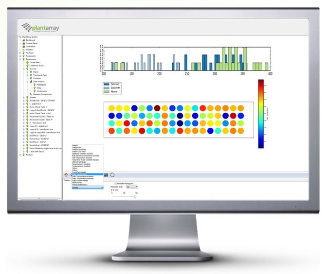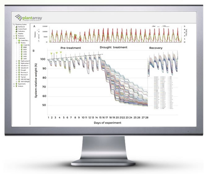 以色列Plant-DiTech公司的Plantarray監(jiān)測(cè)系統(tǒng)是一套高通量,以植物生理學(xué)為基礎(chǔ)的高精度表型系統(tǒng),可以完成整個(gè)植物生長周期中不同環(huán)境下的SPAC(Soil-Plant-Atmosphere Continuum, 土壤植物大氣連續(xù)體)因子的測(cè)量。連續(xù)不間斷的獲取陣列內(nèi)所有植物的監(jiān)測(cè)數(shù)據(jù),實(shí)時(shí)監(jiān)控和及時(shí)調(diào)整每個(gè)培養(yǎng)容器中的土壤條件,包含土壤水分、鹽分。
