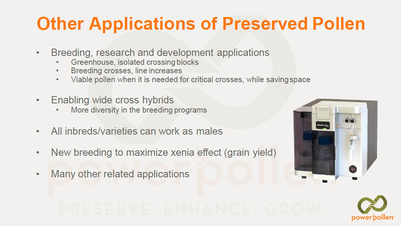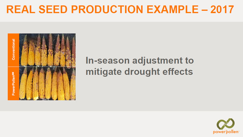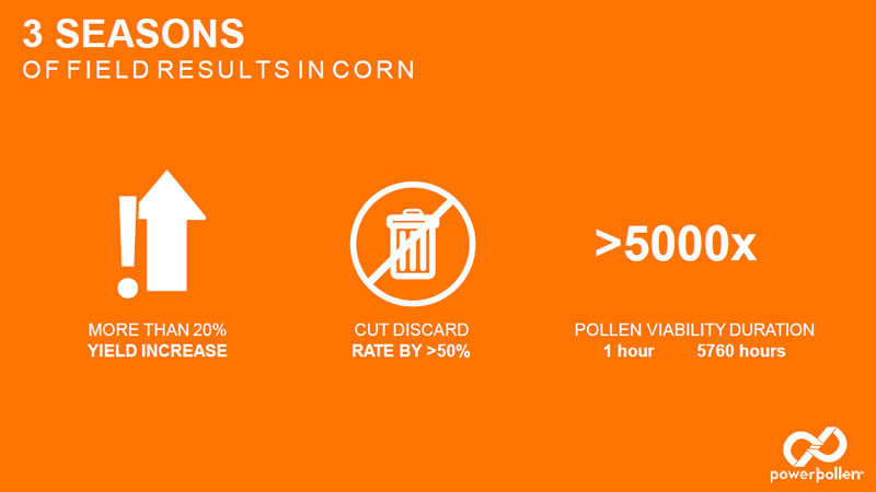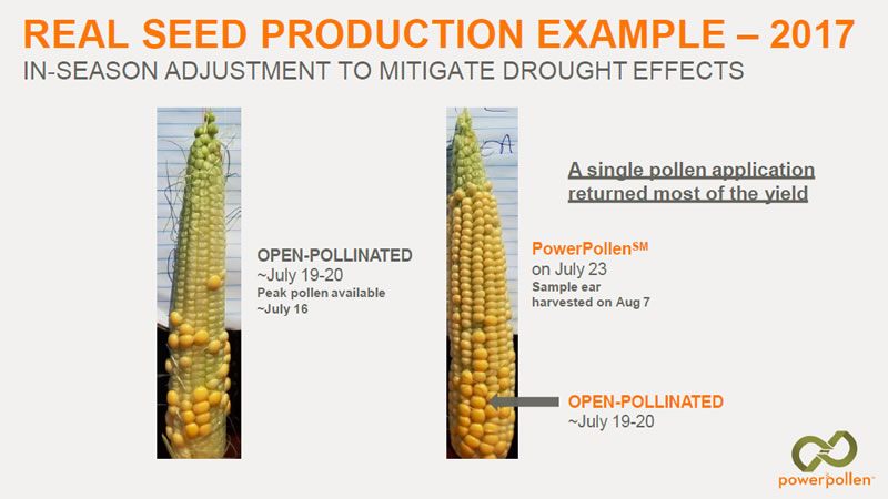 因異花授粉時(shí)機(jī)不當(dāng),已導(dǎo)致全球雜交玉米產(chǎn)量損失15%-25%。在正常情況下,花粉在吐絲后一兩天內(nèi)脫落,使果殼充分受精。然而,當(dāng)雄株的最佳散粉期與雌株的最佳吐絲期不同步時(shí),就無(wú)法成功受精形成籽粒。PowerPollen?公司提供的玉米授粉解決方案,改善花粉保存條件,可在雌株具備最佳的受粉能力時(shí),為種子生產(chǎn)者提供大量高活性玉米花粉,進(jìn)而最大限度地提高種子純度、產(chǎn)量,降低了作物產(chǎn)量下降的風(fēng)險(xiǎn),從而提高了投資回報(bào)率。PowerPollen?公司的授粉解決方案已幫助種子生產(chǎn)者在雜交玉米種子生產(chǎn)過(guò)程中,生產(chǎn)田的單產(chǎn)提高20%以上。