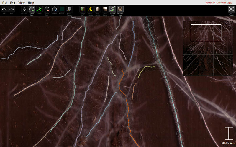 CI-690 RootSnap專業(yè)根系分析軟件安裝在觸摸屏的圖像數(shù)據(jù)處理終端上,可以非常方便的使用手指在根圖上劃過選擇根系(新型方式)或使用鼠標(biāo)點(diǎn)擊選擇根(傳統(tǒng)方式),RootSnap將自動擬合根生長的軌跡,包括調(diào)整根系軌跡弧度,根系角度研究,手指控制放大縮小圖像等。自動測量根的長度、直徑、表面積、體積等參數(shù),還可以一鍵估算圖像中的總生物量。